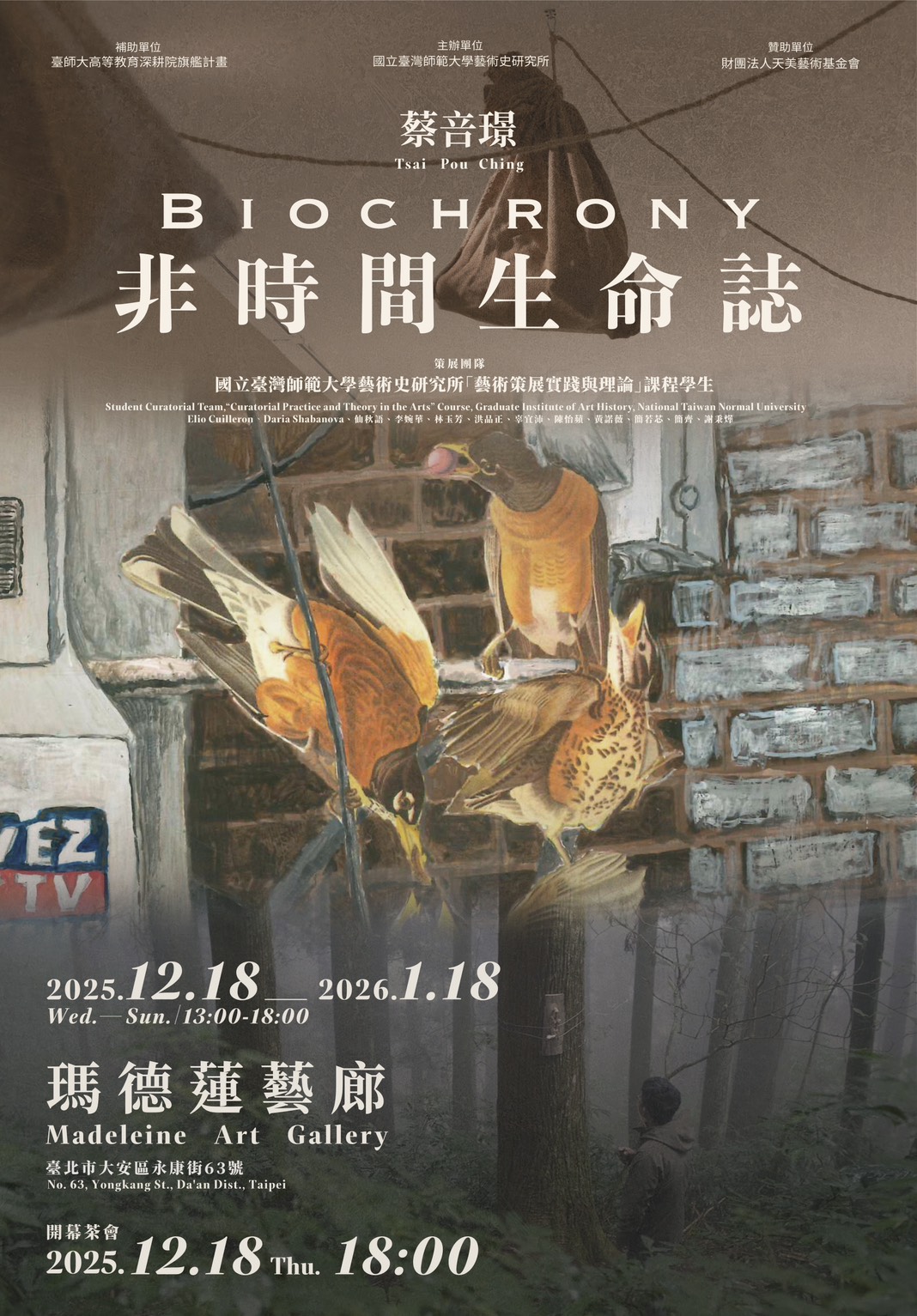 展覽說明非時間生命誌 BIOCHRONY 為藝術家蔡咅璟個展,2025年12月18日至2026年1月18日於瑪德蓮畫廊展出。本展由臺師大藝史所學生組成策展團隊,以新創詞彙為題,關注被淡忘的動物,呈現三件作品,引領觀眾重新思索生命與歷史。