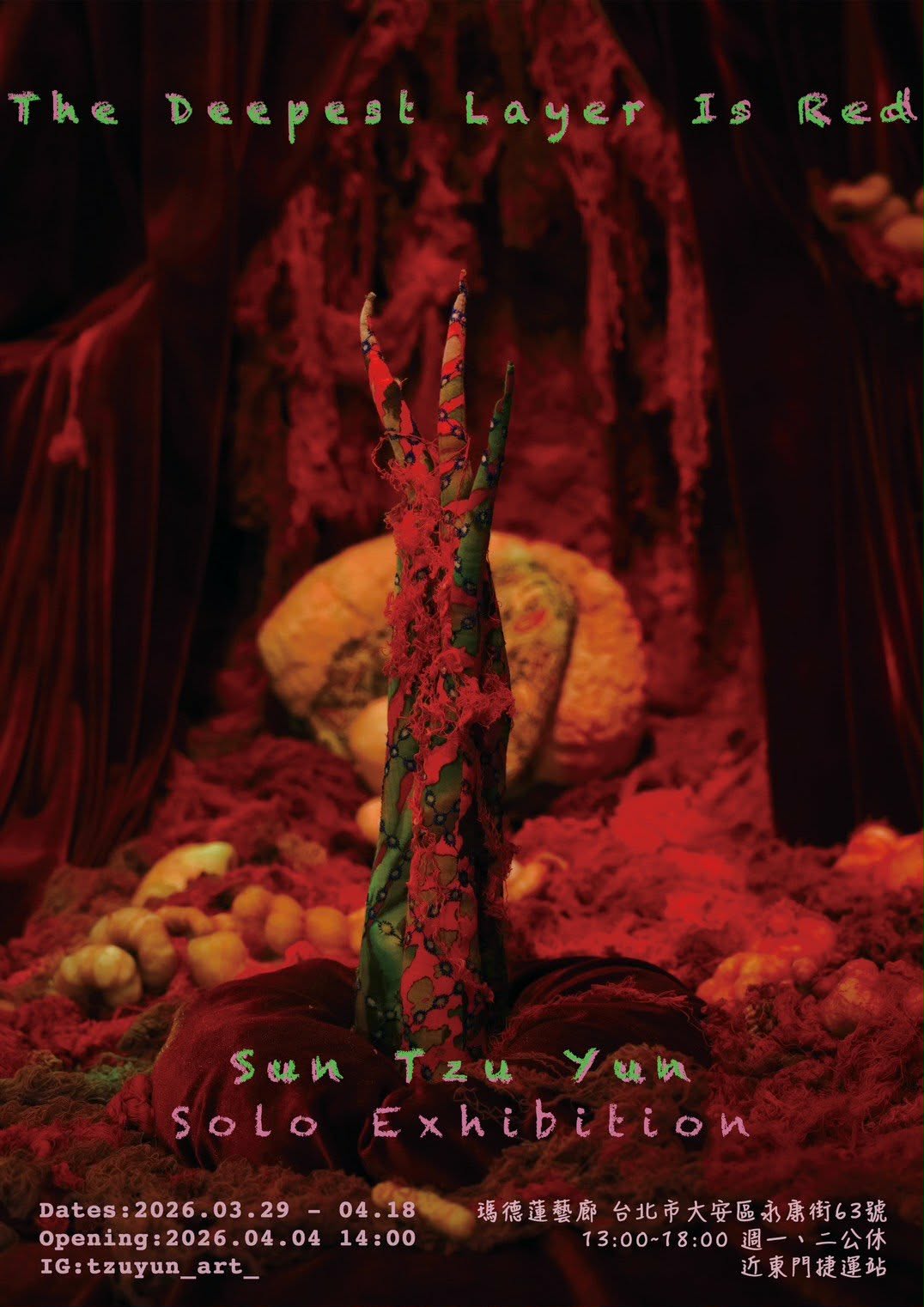 展覽自述《最深的那一層是紅的》是一個仍在發生中的內層,記憶未經命名的部分,身體尚未遺忘的邊界。最深的那一層從未凝固,那些層層包裹,也被反覆觸碰的紅,不是血,而是那些持續滲出、不願結痂的縫隙。